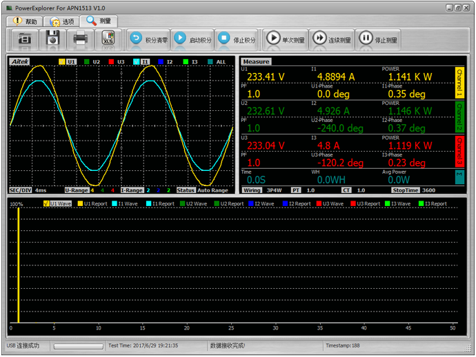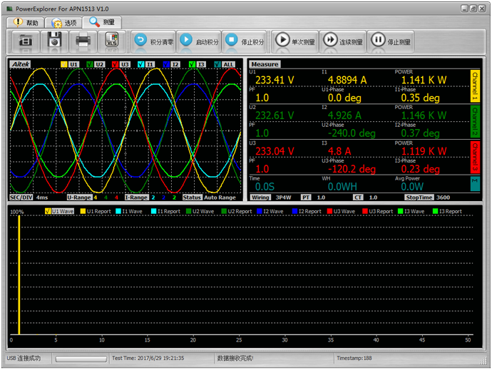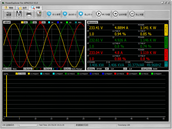 APN1513系列三相功率 分析模块标配的上位机软件,可以实现测量波形显示、测量参数显示、谐波柱状图、谐波报告等显示。